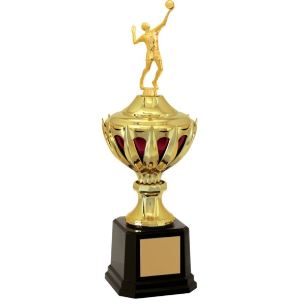 Troféu com 50 cm de altura, com base com 12,1 cm de largura em polímero na cor preto. Na parte superior desta base um suporte metalizado na cor dourado e sobre este suporte uma coroa com 12 pontas com 15,1 cm de largura, com uma copa interna metalizada na cor vermelha e uma tampa metalizada na cor dourado. Estatueta intercambiável de Voleibol. Demais componentes metalizados na cor dourado.