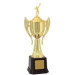 Troféu com 69 cm de altura, com base oitavada com 17,5 cm de largura em polímero na cor preta. Cone em polímero com detalhes na parte inferior metalizado na cor dourada. Copa em polímero metalizado na cor dourada com 24 cm de largura entre as alças. Tampa e alças em polímero metalizado na dor dourada. Estatueta intercambiável de Voleibol.