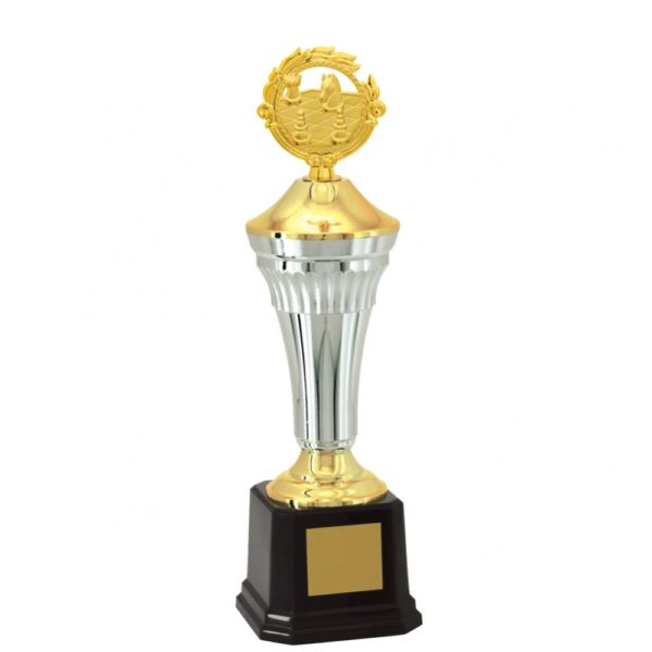 Troféu com 40 cm de altura, com base oitavada com 10,1 cm de largura em polímero na cor preta. Duas tampas em polímero metalizado na cor dourada, intercalado por um cone em polímero com detalhes na parte superior metalizado na cor prata. Estatueta intercambiável de Ramo com Xadrez.