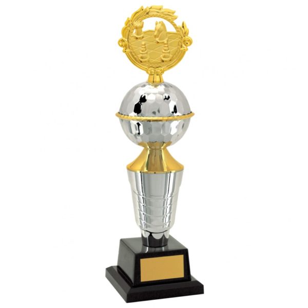 Troféu com altura de 44 cm, base quadrada com 11 cm de largura em polímero na cor preta. Sobre esta base um cone com detalhes em polímero metalizado na cor prata com uma tampa metalizada na cor dourada. Sobre esta tampa uma bola lapidada em polímero metalizada na cor prata intercalada por um anel em polímero metalizado na cor dourada. Estatueta superior intercambiável de Ramo com Xadrez. Acompanha gravação personalizável em adesivo.