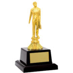 Troféu com altura de 24 cm, com base quadrada com 11 cm de largura em polímero na cor preta. Sobre esta base um suporte em polímero metalizado na cor dourada. Estatueta superior intercambiável de EXECUTIVO.