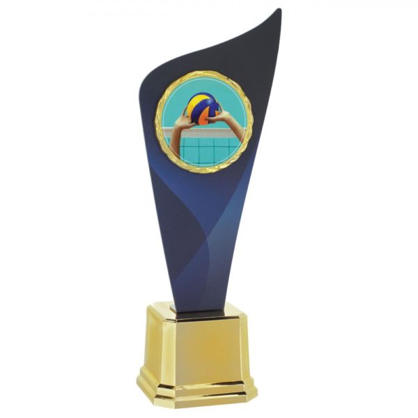 Troféu Dourado de Metal , com 46cm, com Ramo de Voleibol dourada no alto do troféu.