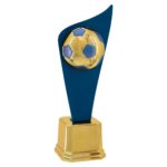 Troféu com 46cm de altura com placa de metal adesivada com tema de futsal. Na parte superior consta uma bola na cor dourada dos dois lados do troféu. Base de polímero na cor dourada. Estatueta intercambiável de goleiro.
