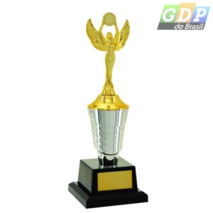 Troféu com altura de 40 cm, base quadrada com 7,6 cm de largura em polímero na cor preta. Sobre esta base um cone em polímero metalizado na cor prata com uma tampa metalizada na cor dourada. Estatueta superior intercambiável. Plaqueta em latão para gravação.