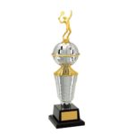 Troféu com altura de 49 cm, base quadrada com 11 cm de largura em polímero na cor preta. Sobre esta base um cone com detalhes em polímero metalizado na cor prata com uma tampa metalizada na cor dourada. Sobre esta tampa uma bola lapidada em polímero metalizada na cor prata intercalada por um anel em polímero metalizado na cor dourada. Estatueta superior intercambiável Tênis de Campo. Acompanha gravação personalizável em adesivo.