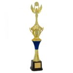 Troféu com 50 cm de altura, com base octogonal com 8,5 cm de largura em polímero na cor preta. Sobre esta base um cone com frisos em polímero metalizado na cor dourada. Sobre este cone outro cone com friso em polímero metalizado na cor azul acetinada e tampa em polímero metalizado na cor dourada, taça polímero metalizada na cor dourada com 10,5 cm de largura a partir das alças com tampa em polímero metalizado na cor dourada.