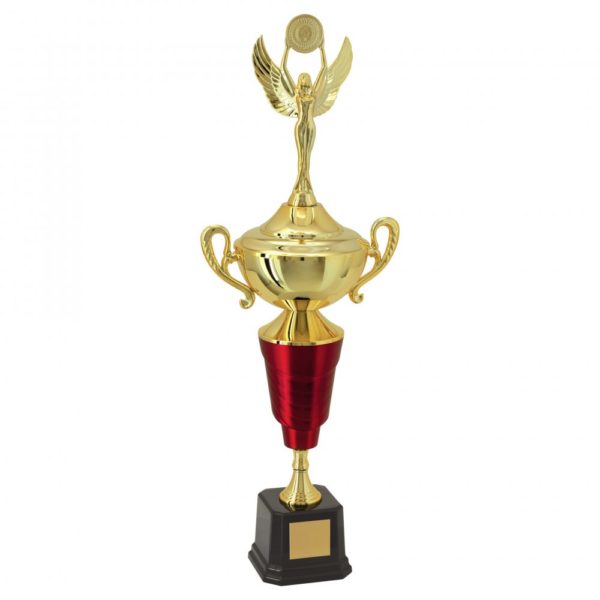 Troféu com 60 cm de altura, com base oitavada com 10,1 cm de largura em polímero na cor preta. Cone em polímero metalizado na cor dourada, cone em polímero metalizado na cor vermelha acetinada com tampa em polímero metalizada na cor dourada. Copa com 21,0 cm de largura entre as alças e tampa em polímero metalizado na cor dourada. (Lançamento 2018)